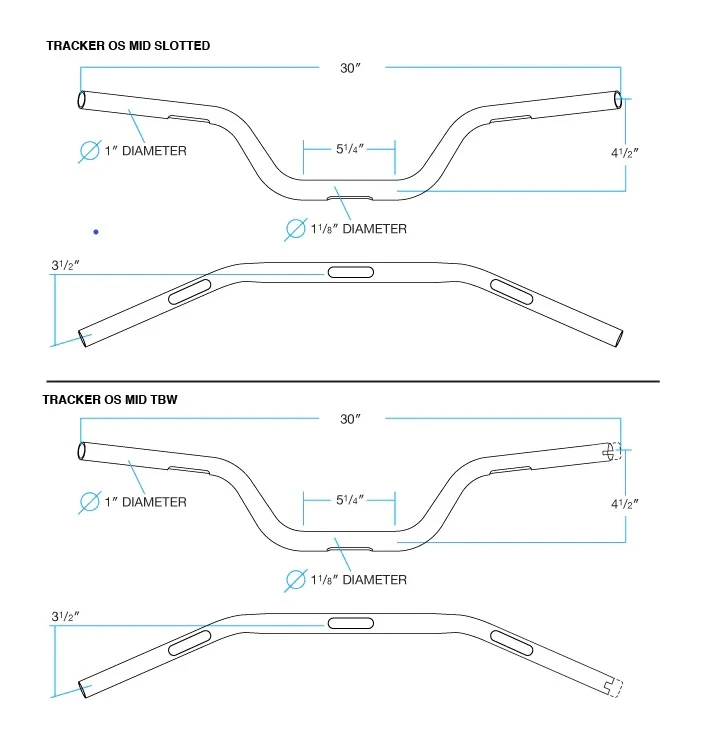 These are a slightly taller version of the popular Tracker Low bars and they look great on a variety of machines. Retrofitment with stock Harley cables and wiring is generally a snap. These bars are slightly wider than many stock bars, please consider turning angle and tank size/mounting before ordering. Get some soon so you can say you were first before everyone else does.