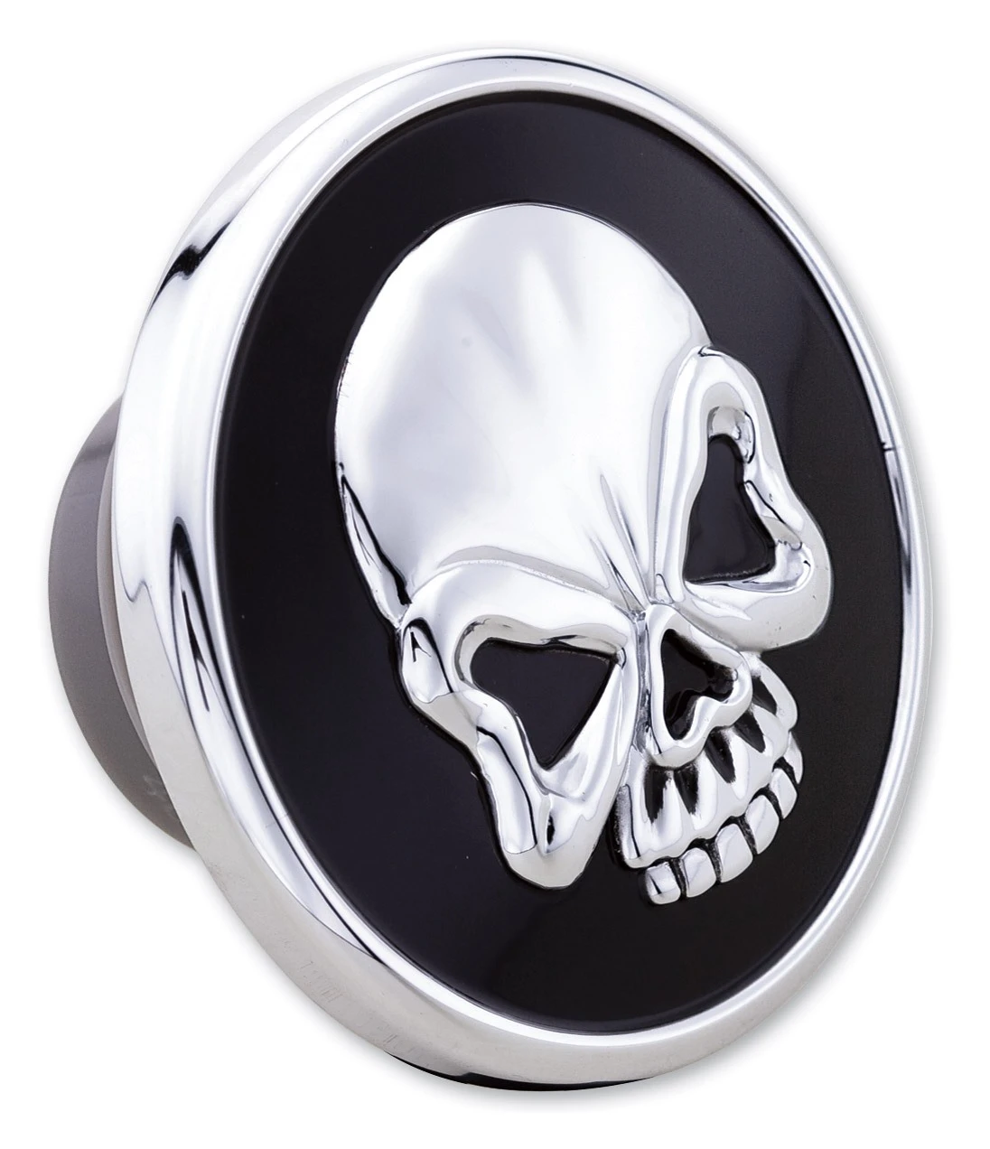 Add some style to your ride with this easy to install upgrade from Milwaukee Twins. The chrome skull on a black background creates an 3-D effect.